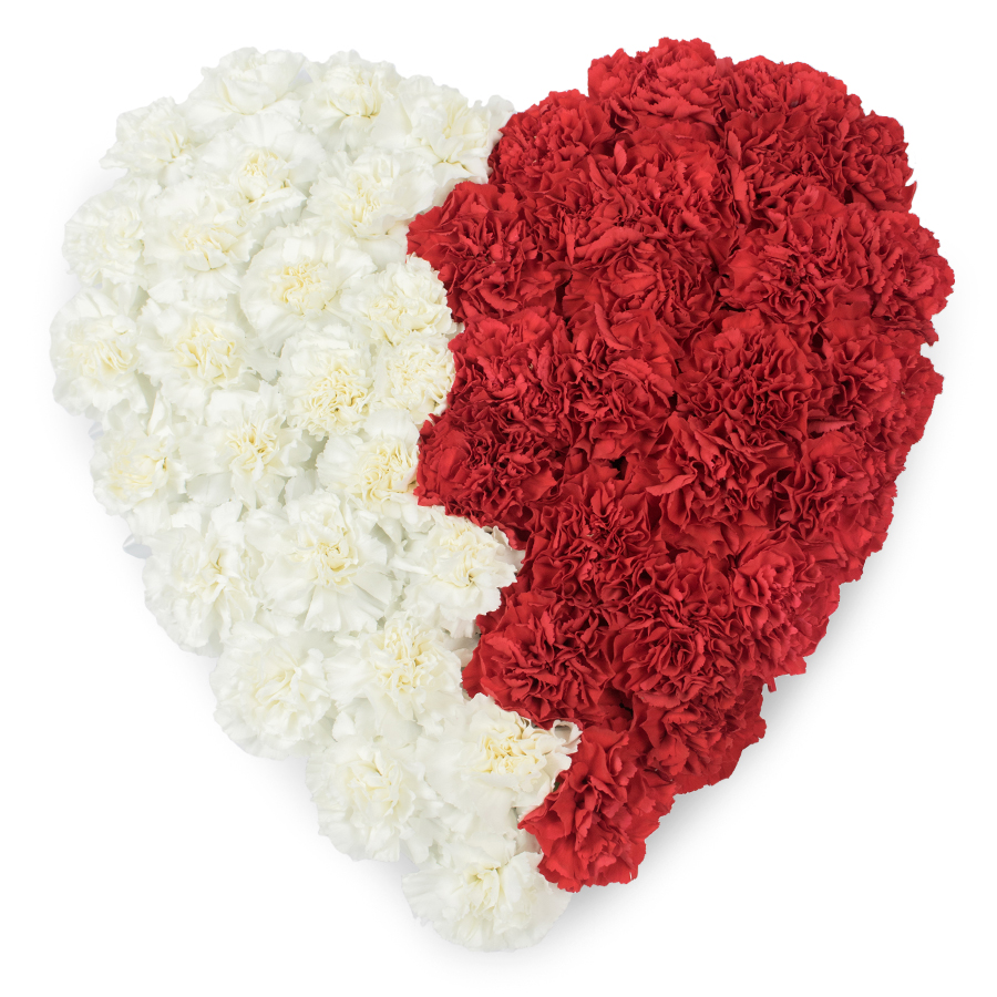 Our stunning heart-shaped arrangement showcases a harmonious blend of white and red carnations, symbolizing love and sympathy. Each flower is hand-picked to guarantee freshness and exceptional quality.